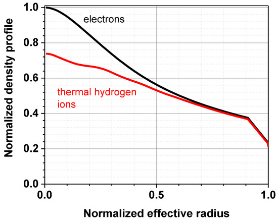 The electron and thermal hydrogen density profiles normalized to the central electron density for a D beam case.