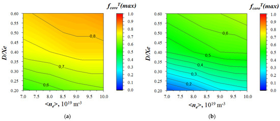 In Figure 2, we can see that for the D + T beam, with an increasing fraction of tritium fcoreT, the efficiency of neutron generation became higher. In the case of the D + T beam, the DT reaction occurs as a result of two processes: the interaction of the fast deuterium ions with the thermal tritium (process 1) and the interaction of the fast tritium ions with the thermal deuterium (process 2). In this case, an increase in the neutron yield of the reaction of the beam–plasma interaction (Figure 2a, Nbp) with an increasing fraction of tritium implies that the contribution of process 1 to the DT reaction considerably exceeds that of process 2. Note that when the fraction of tritium in the plasma is fcoreT > 0.5 and the D beam is used, the neutron yield turns out to be higher (Figure 2b). For both types of the beam, the fraction of tritium in the plasma fcoreT can be different in different operating regimes (within the operating window of the ne and D/χe parameters) due to the considerable effect of the deuterium particle influx from the heating injectors on the isotope composition of the bulk plasma. For both types of the beam, the maximum possible neutron yield is reached at the maximum possible fraction of tritium in the plasma fcoreT(max) (see Figure 2). In this case, the pellets injected into the plasma consist of pure tritium (SpelD = 0). The parameter fcoreT(max) as a function of the ne and D/χe parameters is shown in Figure 3. For the D beam, in the ranges of low densities ne = 7.0−9.0 × 1019 m−3 and D/χe = 0.2–0.3, the small values of fcoreT(max) can be explained by the low flux Spel and, therefore, by the considerable effect of the SNBD flux along with the SpelT flux. Within the operating windows of the ne and D/χe parameters, the maximum possible fractions of tritium are 0.85 and 0.7 for the D + T (fNBT = 0.5) and D beams, respectively.