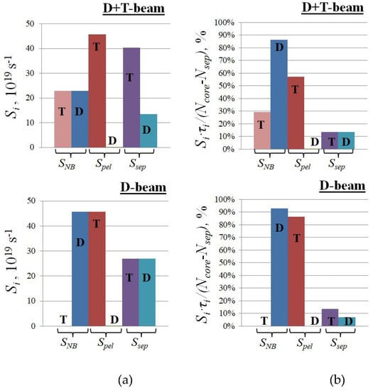 For the scenarios with the D + T and D beams with identical plasma parameters (ne = 8.0 × 1019 m−3 and D/χe = 0.4) but different fractions of tritium fcoreT (0.75 and 0.5, respectively), the absolute values of the SNB, Spel, and Ssep fluxes are shown in Figure 4a. The contributions of these sources to the total number of particles, with allowance for different particle lifetimes for each source, are shown in Figure 4b. It can be seen that a rather large particle flux Ssep from the divertor region (Figure 4a) makes a minor contribution to the total number of particles (Figure 4b). This can be explained by the peripheral localization of this source and, accordingly, by the short lifetime of the particles coming from it. In this case, in the range of the ne and D/χe parameters under consideration, the total flux SpelD + SpelT varies in the range of ~1020–1021 s−1.