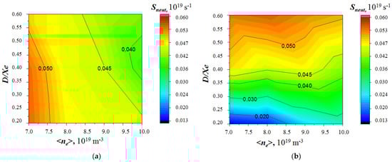 For both types of beams, the Sneut intensities as functions of the ne and D/χe parameters are shown in Figure 5. In this case, the fractions of tritium are maximal, fcoreT = fcoreT(max), which provides the maximum possible neutron yield in the entire range of the parameters under consideration. It can be seen that the dependencies of the Sneut intensities on the parameters are different for the scenarios with the D + T and D beams (see Figure 5a,b). In this case, in the range of the tritium fractions fcoreT(max) > 0.5, the ranges of neutron yield variation turn out to be comparable for both types of beams. However, the maximum values are reached in different ranges of the ne and D/χe parameters. For the D beam, the Sneut intensity is noticeably lower compared with the D + T beam in the range of parameters where fcoreT(max) < 0.5. This is an indirect consequence of the fact that the dependence Sneut(fcoreT) shown in Figure 2 for the central point of the parameter plane (ne, D/χe) is steeper for the D beam than for the D + T beam.