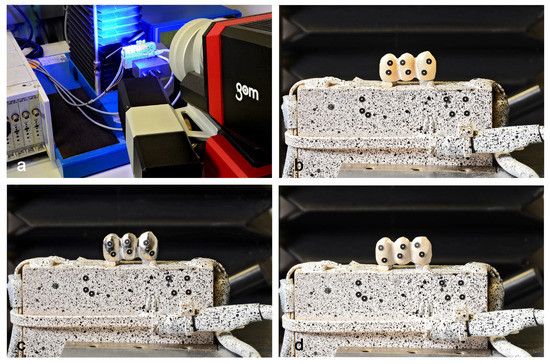 Experimental setup in long shot (a), artificial bone block with stochastic pattern and strain gauges as well as inserted implants and superstructure made of ceramics (zirconia) (b), artificial bone block with stochastic pattern and strain gauges as well as inserted implants and superstructure made of npm (c), artificial bone block with stochastic pattern and strain gauges as well as inserted implants and superstructure made of PEEK (d).