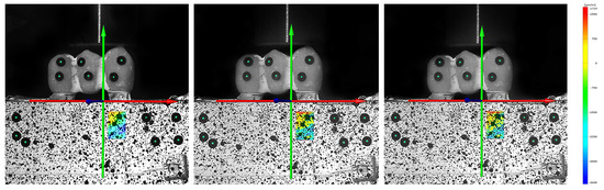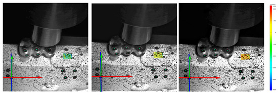 For the optical measurement, two 2D measurement areas were subsequently constructed in the image recordings of the individual tests, each corresponding to the base areas of the strain gauges. These measurement areas were defined once for each test series and transferred to the assigned test recordings. To enable the correct calculation and evaluation of these measurement surfaces, a coordinate system was previously defined in the ARAMIS Professional software for each of the image series. The respective superstructure was defined as a rigid body, which in turn compensated for its movement during loading by calculation. This guaranteed that only the strain of the artificial bone block was measured. For the sake of comparability, the test configuration was not changed between the 15 individual tests in a test series. Figure 2 shows strain gauge 1 with a view to the frontal plane of the bone block and the corresponding virtual measuring surface of the ARAMIS system directly above under increasing force application. Figure 3 shows strain gauge 2 looking at the horizontal plane of the bone block and the corresponding virtual measuring surface of the ARAMIS system directly above it, also under increasing force application.