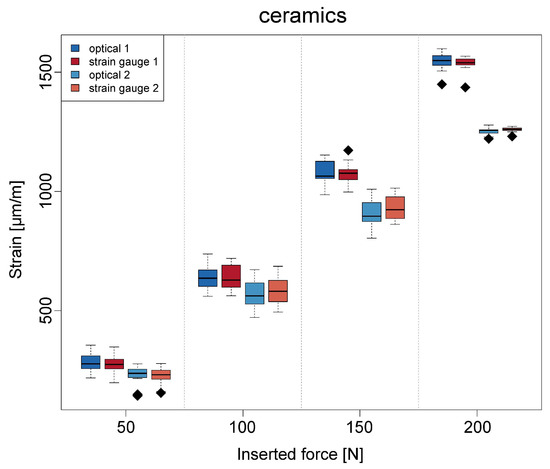 The measured value distributions are presented in the form of box plots for both strain gauges 1 and 2 for ceramic in Figure 4, for non-precious metal in Figure 5, and for PEEK bridges in Figure 6, respectively.