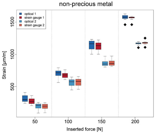 Boxplots regarding the strain at different inserted forces and in the case of the superstructure made of non-precious metal.