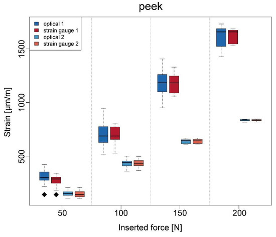 Boxplots regarding the strain at different inserted forces and in the case of the superstructure made of PEEK.