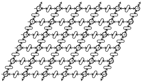 where is the magnetic field coefficient at site , and is the interaction coefficient between and . Ising variables correspond to discrete variables in the metaheuristic. The lowest energy state, called the ground state of , provides the optimal solution. Figure 1 depicts a two-dimensional array Ising model. A circle represents a spin and is connected to four neighbor spins. The arrows ↑ and ↓ represent the up spin (+1) and down spin , respectively.