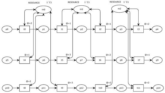 A timed Petri net is a six-tuple , where is the set of time values, and is a function that returns the firing duration time of transition . In this study, we assume that and is a set of natural numbers. A timestamp is also attached to tokens to record the token generation time. In the timed Petri net, the transition is enabled at time k when each input place of has more than or equal to tokens, and its time stamp is no more than k. By firing at time k, the marking is changed according to the same rule as the Petri net described above, except that we attach the time stamp to each output token.