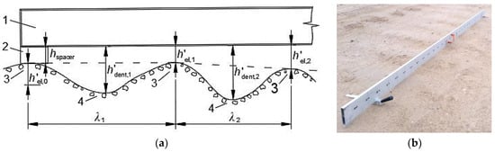 The straightedge method for the pavement rut depth measurement [] was selected for the data collection from the real gravel pavement. The proposed static method is based on measuring the gap between the road surface and a constant length (3.0 m) beam placed along the track corresponding to a vehicle’s left-side wheels. In this study, the straightedge method for measuring gravel pavement longitudinal roughness was adopted, which is usually characterised by higher roughness. Therefore, a small correction in measurement was made by adding 20 mm height spacers () at the ends of the beam (Figure 2). An additional spacer was used in the cases when the end of the beam was over pavement dent.