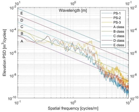 The determined surface roughness of the analysed road section is presented in line with ISO 8608 methodology in the form of displacement spectral density—spatial frequency (Figure 4). The pavement roughness description concerning the PSD log-log plot has a specific break from a smooth characteristic at spatial frequency = 2 cycles/m (Figure 4).