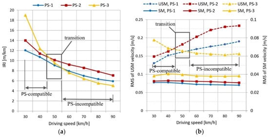The analysis of IRI calculation sensitivity in line with calculation-applicable speed: (a) IRI values; (b) RMS values of SM and USM displacement velocity.