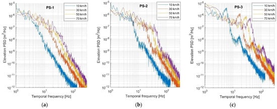 In line with ISO 8608, the presented initial characteristic of the measured road roughness (Figure 4) shows a clear peak of displacement PSD at a spatial frequency of 2 cycles/m for the third pavement surface (PS-3) state. This peak is also repeated at six cycles/m of the frequency range. Such unevenness of the characteristic is considerably weakened in the second pavement surface (PS-2) state and is completely invisible under the best pavement surface (PS-1) state. Converting road roughness characteristics to temporal frequency (Equations (6) and (7)) reveals these characteristics’ irregularities at different vehicle driving speeds (Figure 6). Speeds up to 70 km/h, shown as higher road speeds on the gravel pavement, are prohibited under national road traffic regulations []. The most pronounced fractures in the elevated PSD are observed for the third pavement surface PS-3 state (Figure 6): a peak for 10 km/h at 5–6 Hz, a peak for 30 km/h at 15–18 Hz, a peak for 50 km/h at 23–30 Hz, and a peak for 70 km/h at 33–42 Hz.