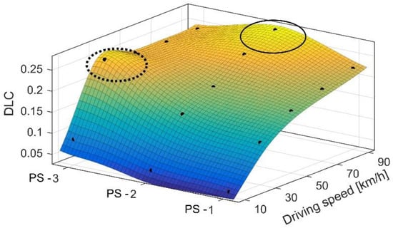 Driving at lower speeds (10–30 km/h) through short wavelength roughness (PS-3) formed on the gravel pavement (macro-texture level) demonstrates that vibration frequency caused by waves approaches the natural frequency of vehicle USM (11–15 Hz). This order vibration tends to increase the variability in the normal load of the wheel described by the DLC [,]. The normal force of the tyre depends on suspension characteristics []; however, road pavement and driving speed have a direct influence. The calculated DLC values for the quarter car model working at a broad speed range (10–90 km/h) are shown in Figure 7. Here, the Golden car model simulation in the MATLAB/Simulink environment was used. Conforming to the pavement surface state, the obtained DLC values have the same distribution as the IRI (Table 1) due to the dominant movement of the USM (the highest RMS of the USM for PS-2). Both tendencies (IRI and DLC) prove that the second pavement surface (PS-2) state excites resonant motion for the analysed light car model.