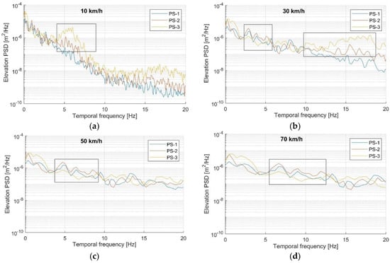 Roughness representation in the temporal frequency: (a) 10 km/h; (b) 30 km/h; (c) 50 km/h; (d) 70 km/h.