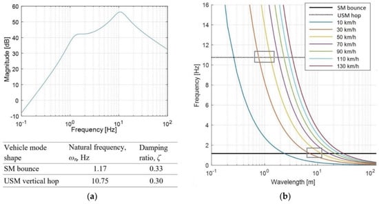 Sensitive vehicle frequencies of pavement wavelengths: (a) Natural frequencies and damping ratios of the Bode plot; (b) wavelength frequency characteristics conforming to driving speed.