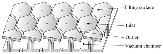 In 2011, Vuong explored a new concept regarding contactless positioning, “Air-based contactless actuation system for thin substrates” [4]. The concept is based on multiple tilted surfaces to steer the airflow, and therefore the force on the substrate. The advantage of the tilting surface is that a change in the geometry directly generates a change of the shear force on the substrate. This concept does not suffer from the delay between the controlling action and force as seen in the first generation. In this concept, the in- and outlet pressure can be kept constant. The concept where the surfaces are tilted by bending the shafts is shown in Figure 2. This concept is used in this paper for the precision contactless positioning of the wafer and is explained in detail in the next section.