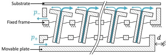 Schematic of the second generation contactless actuator, showing the flow of air through the system, for a displacement d of the movable plate [13].
