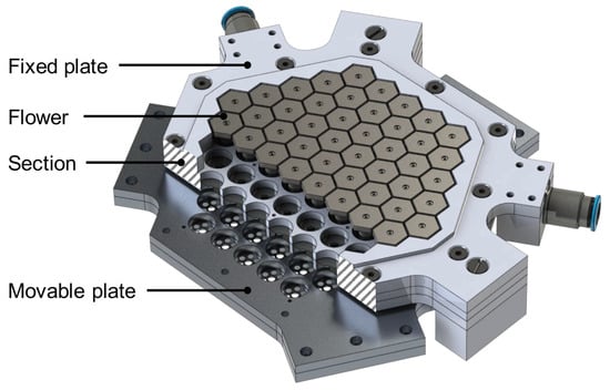 Figure 4 shows a cut-through view of the Flowerbed. The Flowerbed has 61 hexagonal heads, with an in-radius of . It is nicknamed the Flowerbed because the surface looks like flowers that tilt towards the sun. The hexagon shape of the flowers was selected because it provides a full packing of the surface in combination with an optimal circumference to surface area ratio, and thus a maximum force for a given airflow. Furthermore, the figure also shows the fixed plate and movable plate, where both consist of two plates that are clamped together with a thick membrane in between. The membrane is also clamped in the flowers. To better align the flowers, the movable plate is preloaded downwards with three springs, with a force of approximately . After assembly, the final step was the spark erosion of the surface with wire-cut EDM technology to further level the surface.
