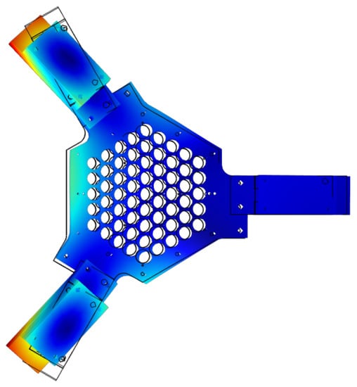 In 2016, Krijnen designed a reluctance actuator to actuate the movable plate of the Flowerbed [14,15]. Reluctance actuators can provide a high force, but they also have a high mass. With the use of fractional order control, this resulted in a control bandwidth for the Flowerbed of . The bandwidth was limited by the eigenmodes caused by the actuator as shown in Figure 7. Figure 8 shows the flapping mode of the actuators that was limiting the bandwidth. The position of the wafer is measured using optical sensors. This required that gratings are attached to the wafer. The position of the wafer is controlled with a bandwidth of .