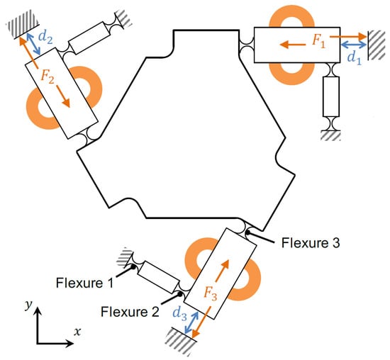 Figure 9 shows the chosen guidance for the movable plate. In the figure, the application point of the force and sensor are shown, as well as the notch flexure and guide linkages. The sensors that measure the actuator displacement are placed close to the actuator.