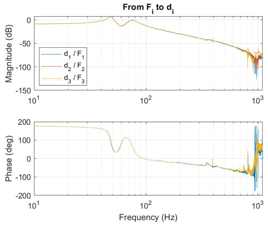 The closed-loop response of the system is similar for all three actuators. The response provides a good basis for the outer loop controller up to, at least . The system shows strong coupling at , this could be improved using a decoupling filter or by prefiltering the input. Because the bandwidth of the outer loop is limited, it is chosen to use the outer loop controller to prefilter the reference signal.