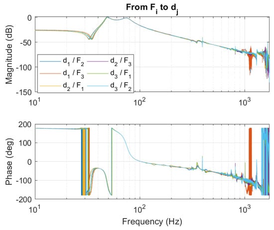 Closed loop cross coupled frequency response of the actuators, from actuator reference position to measured position.