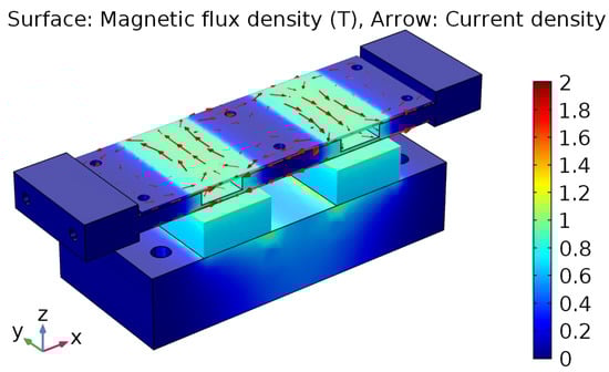 Simulation showing the magnetic flux density (in on the colorbar) and the eddy current density (arrows) [13].