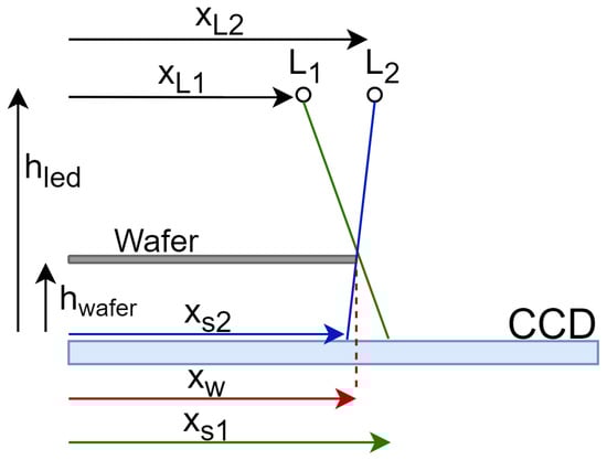A CCD sensor with 2 LEDs, showing the actual position of the wafer , the shadow created by the first led and second led .