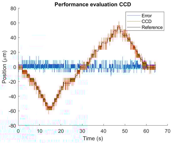 Before the implementation of the CCD sensor inside the contactless actuator, a performance analysis experiment was done. In these tests, the linearity of the sensor was tested, as well as the steady-state behaviour. The performance test was performed in an environment where disturbance sources from the external lighting, vibrations, and the electrical side were not removed. The steady-state response shows no drift and high precision, since the position returns to the same position. Figure 20 shows the performance analysis test where the position of the CCD is compared to a stage that has a resolution of . The figure shows no drift and follows the position of the stage with an error of RMS.