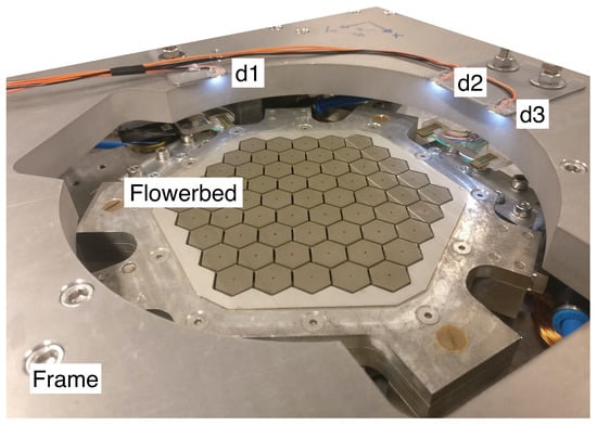 Photograph of the Flowerbed system with the implemented contactless sensing system without the wafer. The position of the sensors has been annotated according to Figure 21, and for reference, the diameter for the inscribed circle in each of the 61 hexagonal flowers is 14 mm.