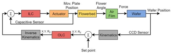 To control the position of the wafer, a second controller needs to be added to the inner loop Flowerbed control. This leads to a cascaded control structure as shown in Figure 23. The Flowerbed controller will be called the inner loop controller (ILC) from now on. The ILC will provide a stiff connection between the Flowerbed and actuator. The setpoint of the ILC will be controlled by the wafer controller, which is also called the outer loop controller (OLC). The kinematics and inverse kinematics are placed in the loop of the OLC, because the OLC has a lower bandwidth and thus more time for the calculations.