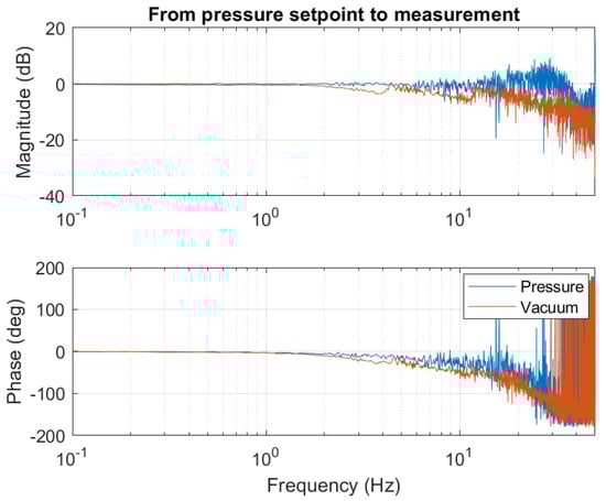 To control the pressure, sensors and valves are placed in the supply lines. The dynamic behaviour of the pressure and vacuum supply has been identified around the operation pressure of supply and vacuum. The controller design is a proportional gain together with a second-order low pass filter with the values provided in Table 3. The lower bandwidth has been chosen because of the limitations of the solenoid valves, increasing the bandwidth further does not improve the performance. The closed-loop frequency responses for the pressure controls are shown in Figure 24. During control the steady-state error is measured, the error for the vacuum controller is and for the pressure controller .