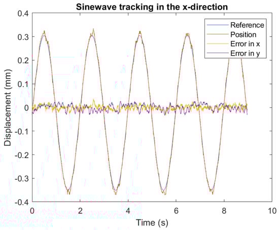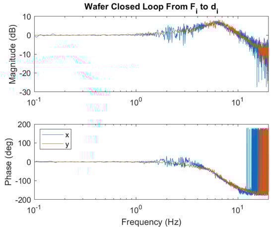 After tuning the controller for the inner loop, outer loop, and pressure, the performance of the positioning of the wafer has been measured. Figure 25, shows the closed-loop response of the system. The measurements for the cross-coupling between the x and y-axis are insignificant and thus not presented in the frequency domain. The error of the x and y-axis during tracking is presented in Figure 26. Furthermore, when tracking a sine wave with an amplitude of at , the RMS error of x and y remained under .