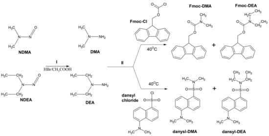 - Cárdenes, L.; Ayala, J.H.; González, V.; Afonso, A.M. Fast microwave-assisted dansylation of N-nitrosamines: Analysis by high-performance liquid chromatography with fluorescence detection. J. Chromatogr. A 2002, 946, 133–140. [Google Scholar] [CrossRef]