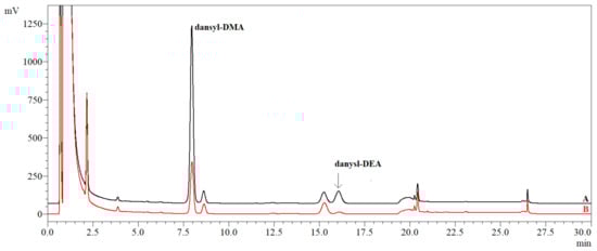Contrary to the rather weak response of dansyl chloride, Fmoc-Cl requires much lower values of sensitivity and gains in fluorescence detection. What is more, DMA and DEA can also be determined using a common UV-VIS detector (265 nm, Figure 4); however, a fluorimetric detector offers better sensitivity (Figure 5).