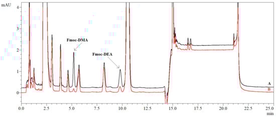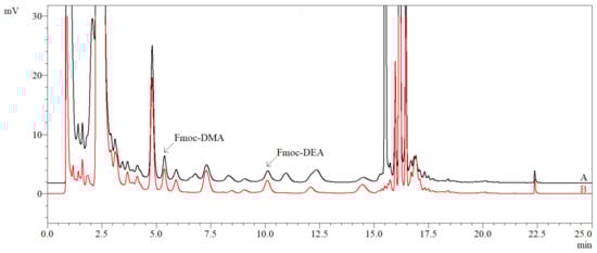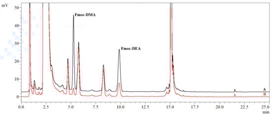 During the method development, it became evident that it is essential to use Fmoc-Cl of the highest available purity, based on our previous experience with dansyl chloride. When Fmoc-Cl 97% was used, a much greater peak from the DEA derivative was observed in the blank solution. Additionally, deionised water was boiled before each use to remove possible contaminations with volatile DMA and DEA.