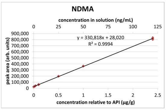 Calibration curve for NDMA. The upper x-scale expresses the concentrations in the solution in ng/mL, and the lower x-scale shows the concentrations in relation to the API, expressed in μg/g.