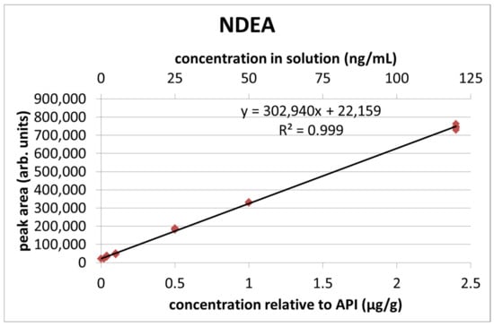 Calibration curve for NDEA. The upper x-scale expresses the concentrations in the solution in ng/mL, and the lower x-scale shows the concentration in relation to the API, expressed in μg/g.