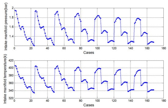 The intake manifold temperatures and pressures of the 168 cases are plotted in Figure 3.