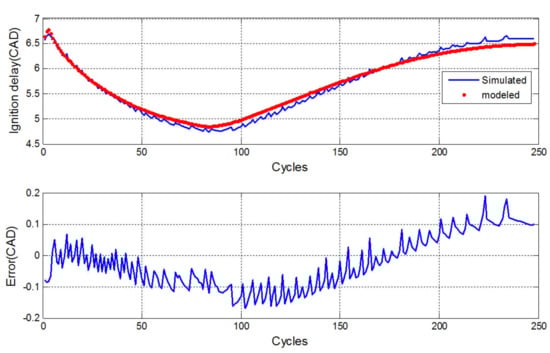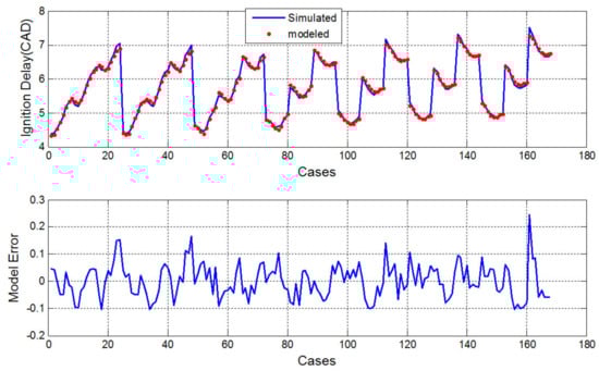 By applying the calibrated model (Equation (17)), the modeled ignition delay is plotted in Figure 6.