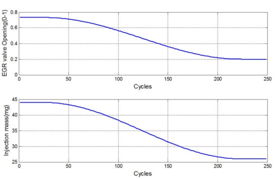 For validating the model, a transient case is simulated. The engine runs from cold start for 250 cycles with continuous changing of EGR valve and injection mass. The operating conditions are shown in Figure 5.