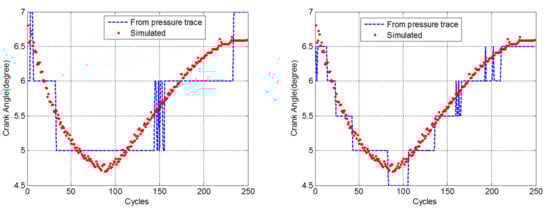 Usually, the ignition delay is within a range of 10 CA degrees, such short period means the sampling rate of the pressure sensor is of critical importance. A stair effect may appear if the sampling rate is too low. The effect of the pressure sampling rate on the reconstructed ignition delay is simulated and shown in Figure 8.