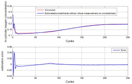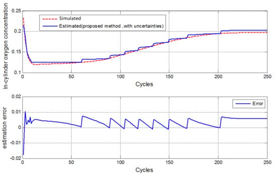 Figure 11 shows that due to the inaccuracy of the volumetric efficiency, the dynamical model cannot estimate the ICOC accurately, the convergence cannot even be guaranteed. The estimation error is about (−0.05, 0.05) at cold start state, and (0, 0.03) at steady state, which is unacceptable for ICOC with a range from 12% to 23%.