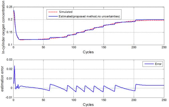 Figure 9 shows the performance of the dynamical model based method when there are no uncertainties. The 2 main remarks can be found in Figure 9: (1) At cold start state, the estimation results are rather poor (roughly (−0.05, 0.05)) due to the inevitable pressure and temperature fluctuation on this engine state. (2) At steady state, the estimation results tracks the simulation value well with the error less than 0.01.