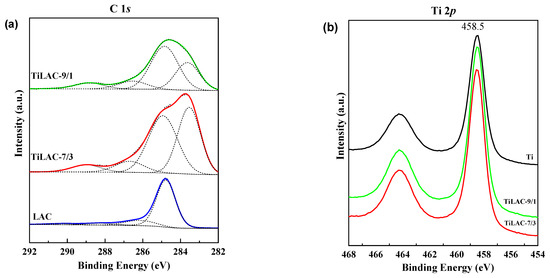 In the case of samples containing both titania and LAC, a new contribution at ca. 283.7 eV appeared. This new contribution is due to the presence of two phases with different conductivity, that is LAC and titania, and is also due to adventitious carbon.