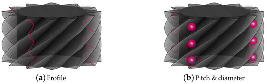From a production metrology point of view, the transverse pitch in Equation (37) is far more useful than the established axial pitch in Equation (36). Since the transverse pitch obviously relates to only one geometry parameter from the model, it is very clear how the machine settings have to be readjusted to compensate for a pitch error. In the case of the axial pitch, a deviation can account either for an incorrect helix coefficient c, a false flank angle represented by m, or a deviation in the rotational position of the flank in the transverse section denoted by . This separation of error sources is vital for reliable quality assurance and stems from the strict application of the coordinate metrology principle demanding the separation of dimension, form, and pose.