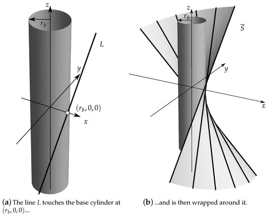 Additionally, we introduce the starting polar angle of the generating line L at to allow a rotation around z of the complete surface. The parameters defining the surface are combined in the variable and Equation (2) reads as