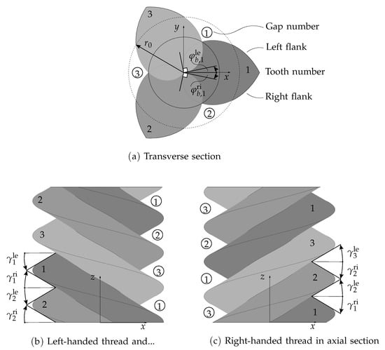 In the case of a screw thread, the generating line (or its prolongation) has to intersect the z-axis, hence . Moreover, the slope m of the generating line is given by with the flank angle [6,8]. The definitions of left and right flanks are given in the transverse section (Figure 4a). Note that the relation to the corresponding flank angles depends on as illustrated in Figure 4b,c.