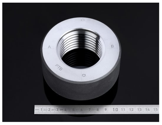 A screw thread ring gauge M (Figure 5) was calibrated applying the holistic approach presented in [39]. The part had previously been used in a national intercomparison among 20 calibration laboratories where it was measured in the conventional manner [31]. It was only through the application of the holistic calibration procedure that the dimension of a roundness deviation could be revealed for the first time.