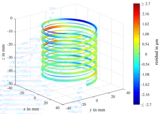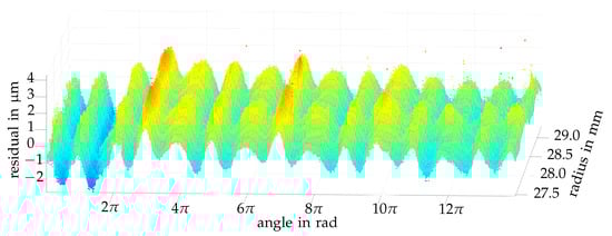 In contrast, the holistic method determines the pitch based on all measuring points and calculates the mean position angle , which then leads to the cumulative pitch deviation according to Equation (29). This corresponds to a plane in Figure 11 at residual . As a consequence, the pitch assessment is far more stable, resulting in both smaller measurement uncertainties and in better linkage to machine parameter settings to allow proper failure analysis.