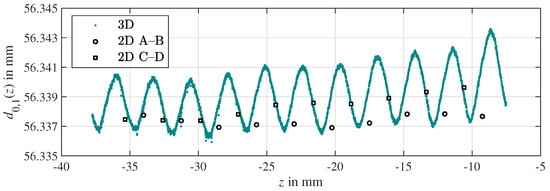 As reported in Section 2.2, screw threads are conventionally inspected in two specific axial sections (A–B and C–D) in a pointwise or linewise manner. The pitch diameter (Equation (33)) determined with the holistic evaluation method (3D) is compared to conventional calibration results (2D) in Figure 8. Pitch diameters are shown with respect to the z-coordinate. Symbols represent the conventional 2D result. The sampling rate is not sufficient to capture the ellipticity. In contrast, the dimension of the ellipticity is clearly determined by the 3D method.